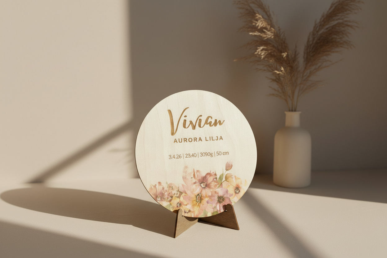 Syntymätaulut, kakkukoristeet, kummitodistukset ja muut personoitavat lahjat ja koristeet.