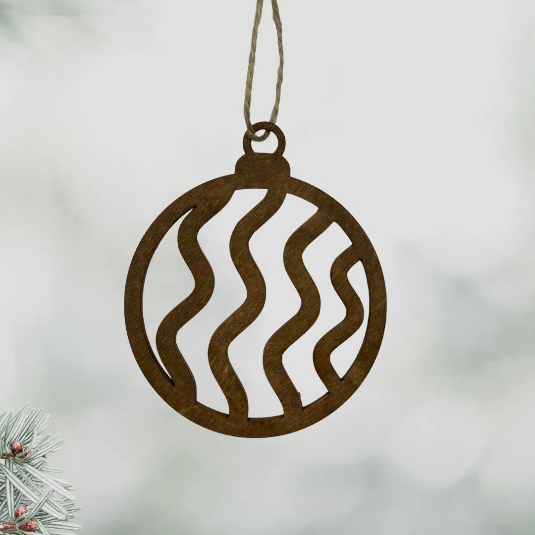 Kaunis puinen joulukuusenkoristepallo, jossa aaltoileva muotokieli. Ajaton valinta joulusisustukseen.