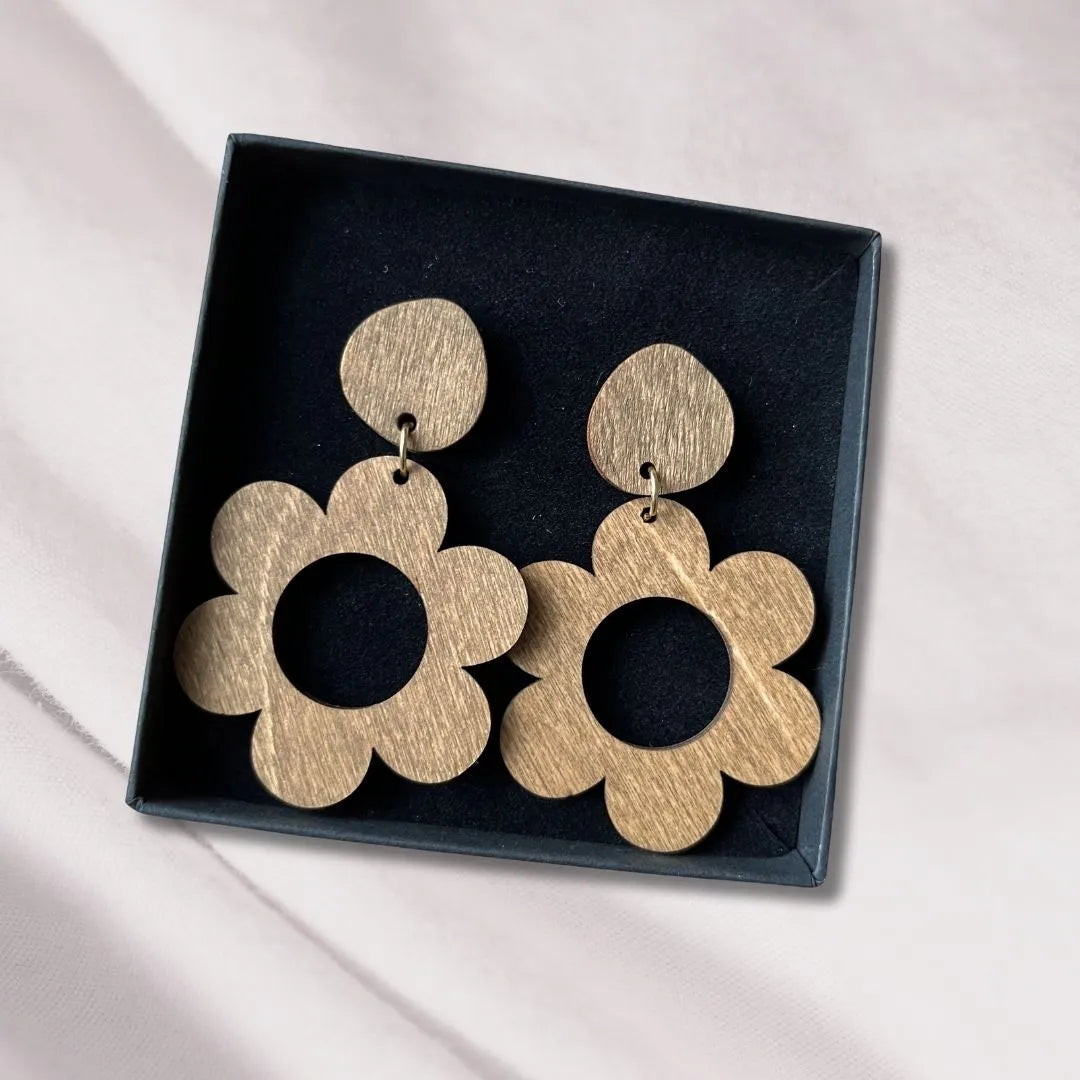 Roikkuvat korvakorut, joissa maanläheinen tunnelma. Korvakorut ovat valmistettu koivuvanerista, joten ne ovat kevyet ja miellyttävät pitää. Jokainen koru on valmistettu käsin, ja jokaisessa näkyy uniikit puunsyyt.